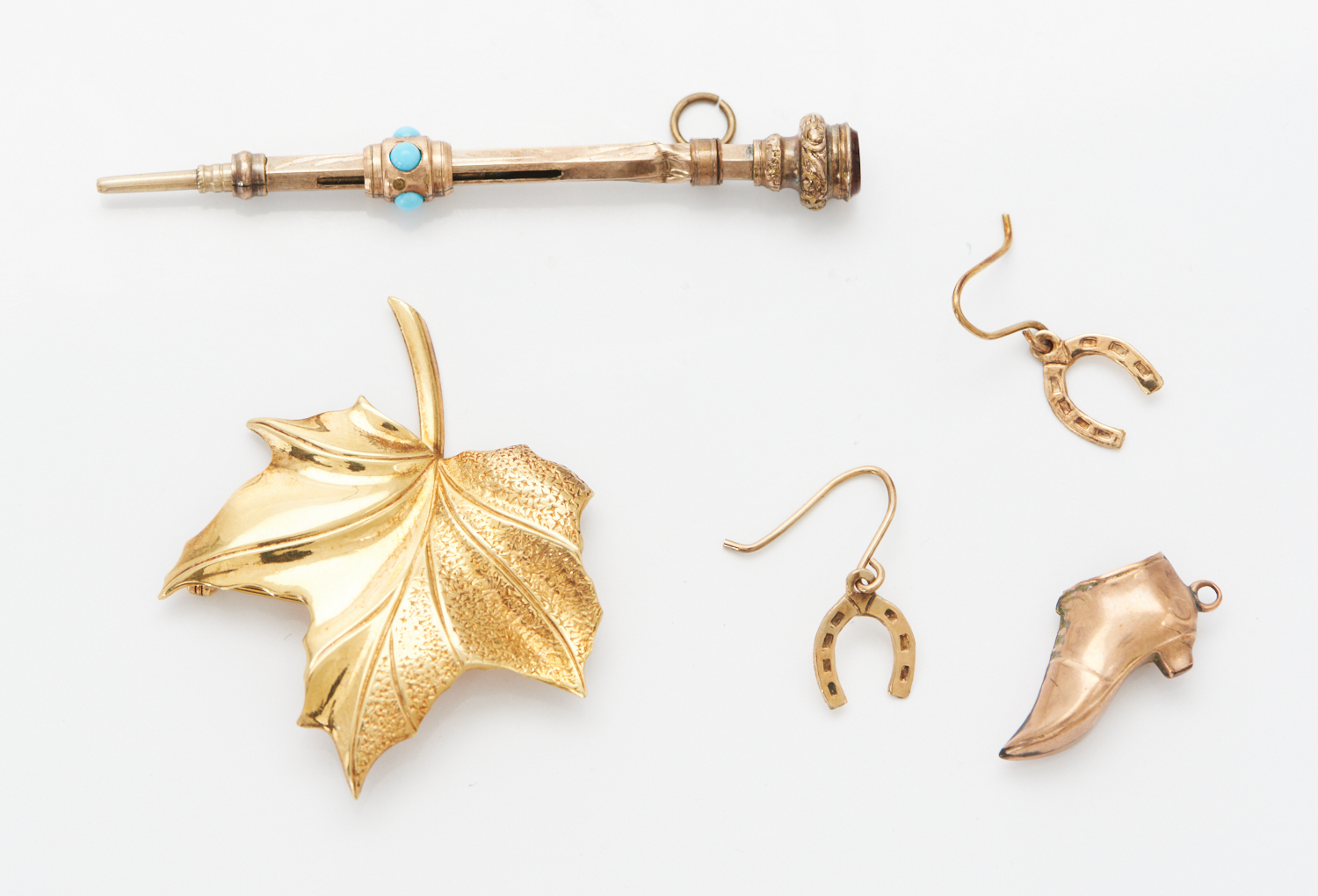 A COLLECTION OF GOLD FINDINGS INCLUDING A LEAF BROOCH, VICTORIAN SHOE PENDANT, AN ANTIQUE PROPELLING PENCIL AND A PAIR OF HORSESHOE EARRINGS, ALL IN 9CT GOLD, TOTAL WEIGHT 6.3GMS