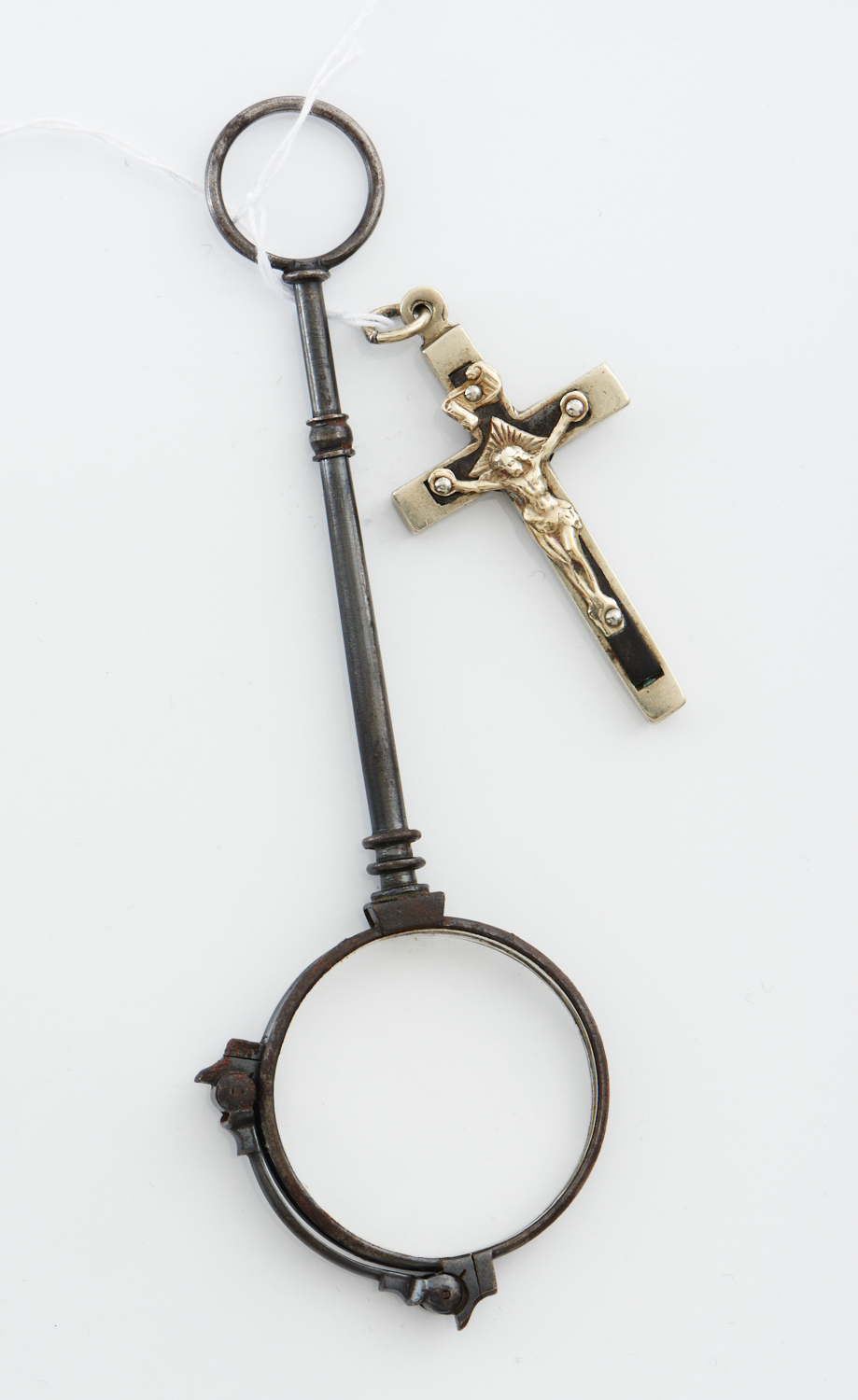 AN ANTIQUE LORGNETTE, TOGETHER WITH A CRUCIFIX PENDANT