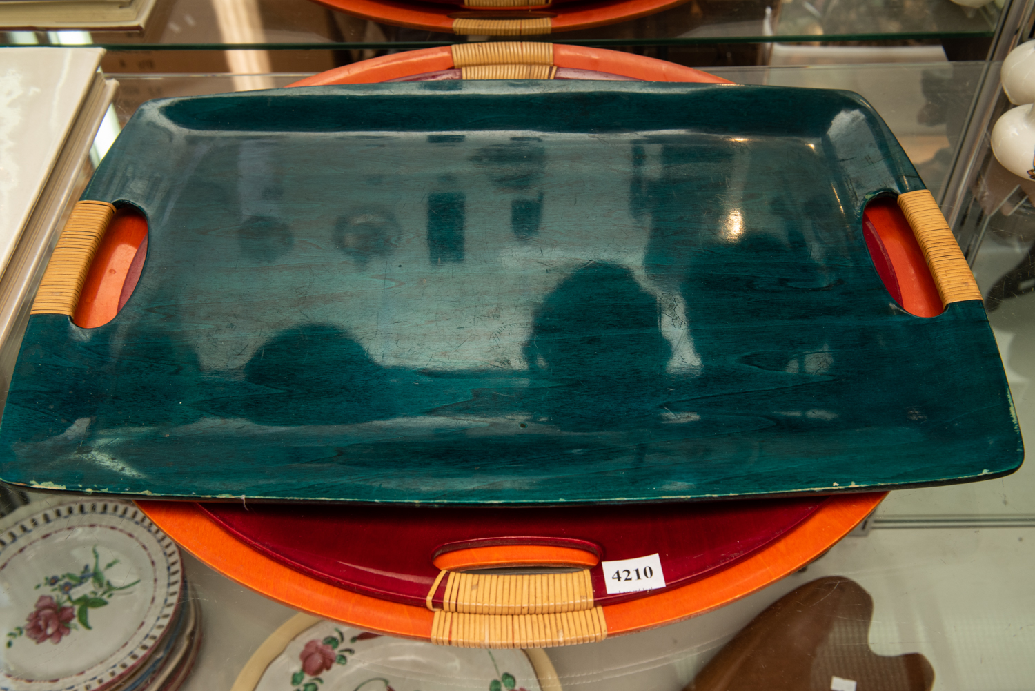 A TRIO OF 1960S LACQUER SERVING TRAYS WITH RATTAN HANDLES, LARGEST DIA.50CM, LEONARD JOEL LOCAL DELIVERY SIZE: SMALL
