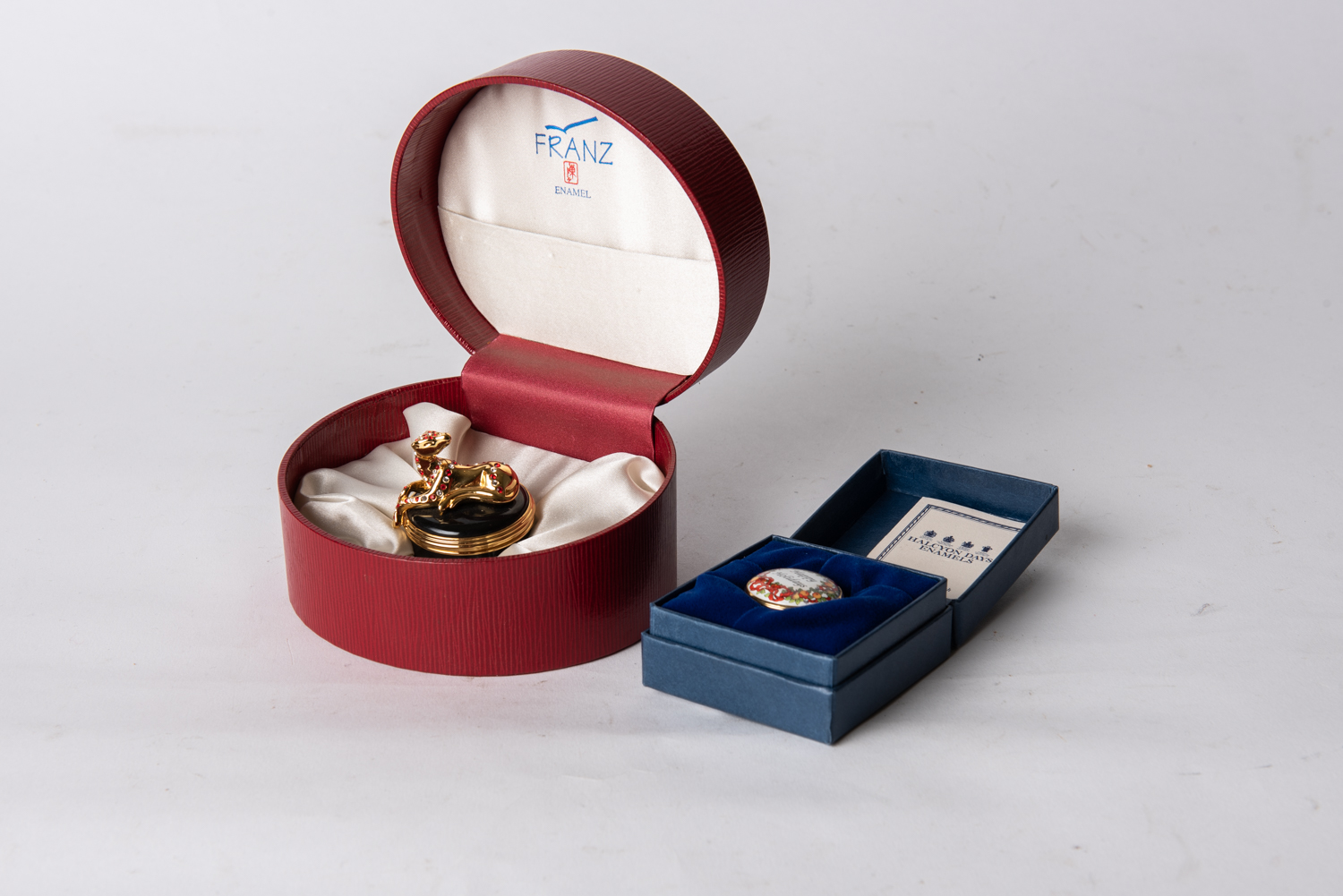A BOXED HALCYON DAYS ENAMEL PILL BOX AND ONE OTHER NOVELTY PILL BOX, LEONARD JOEL LOCAL DELIVERY SIZE: SMALL