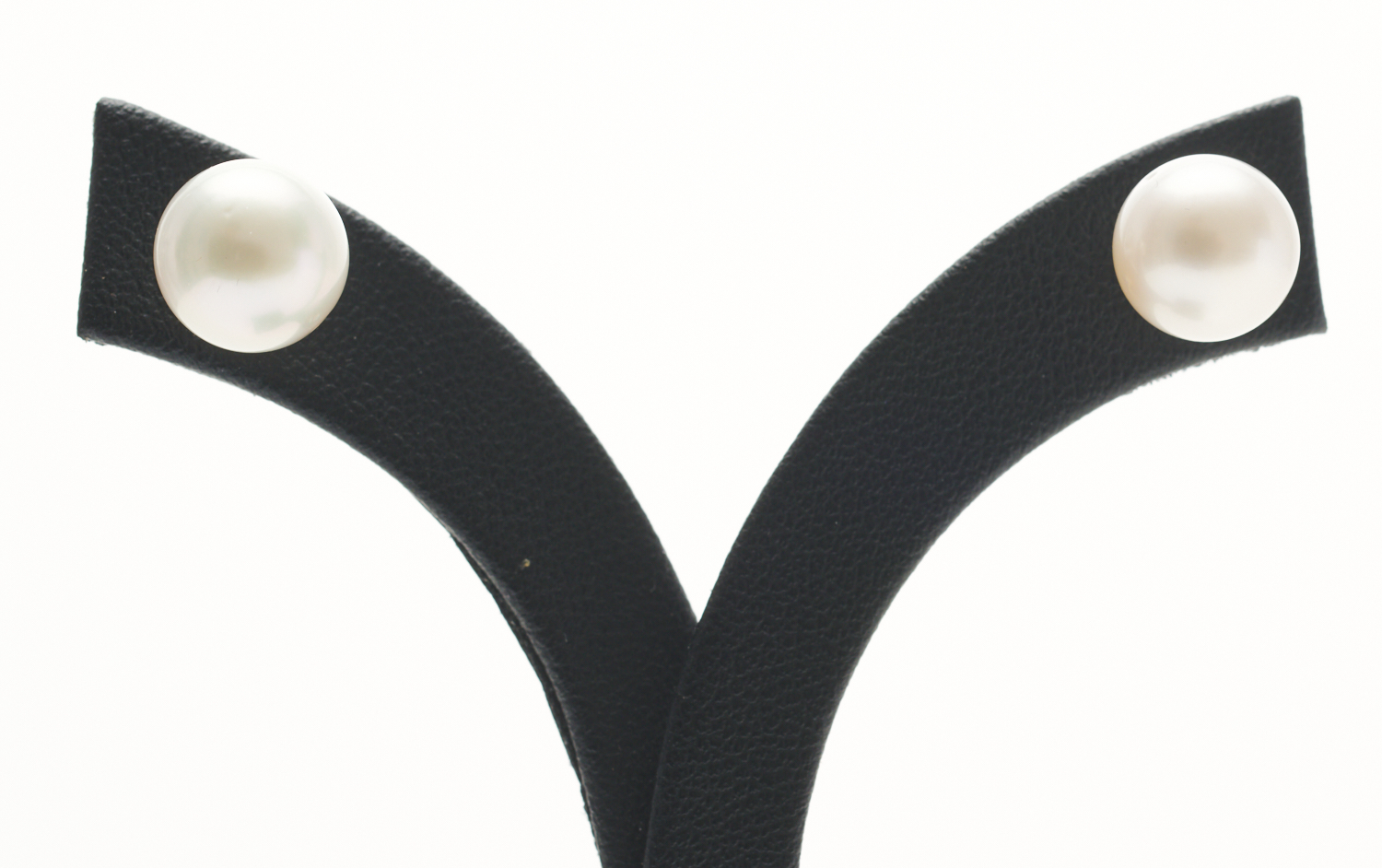 A PAIR OF SOUTH SEA PEARL STUD EARRINGS Each earring comprising a round pearl of silver white hues measuring 8.5mm-9.0mm, in 18ct white gold.