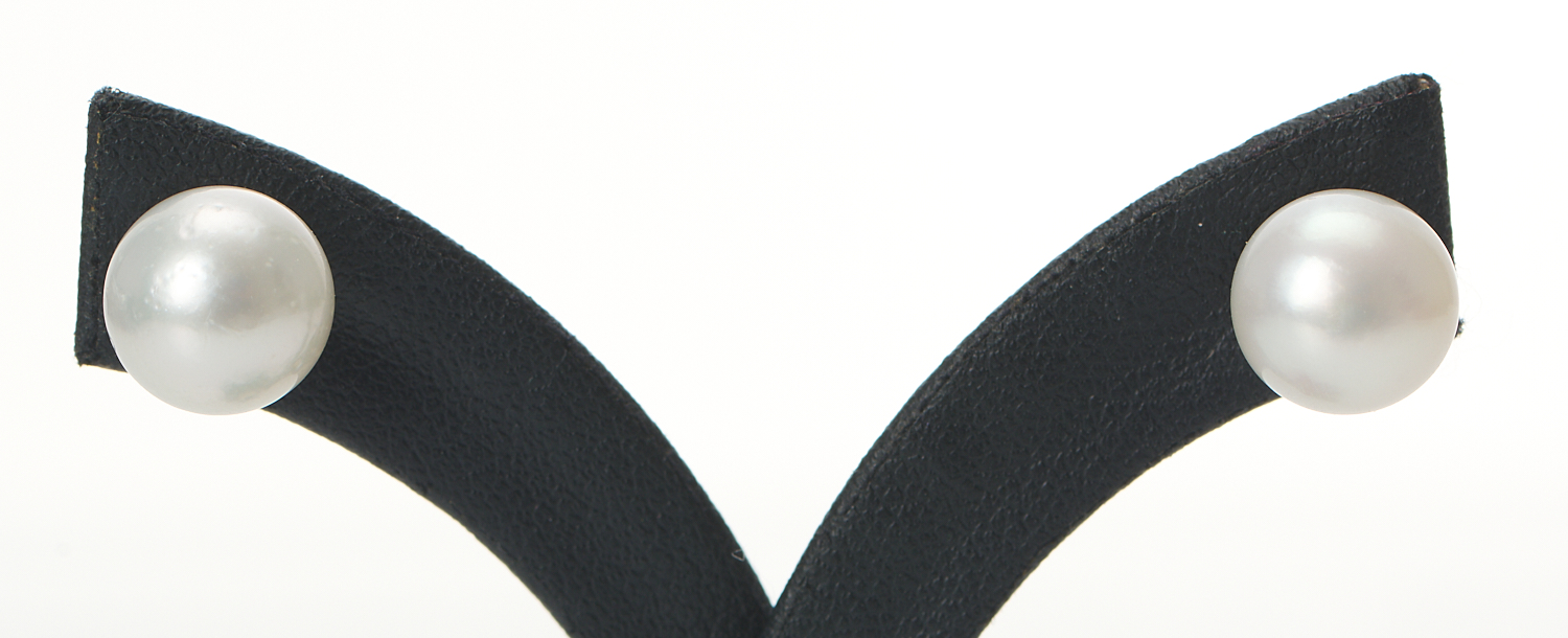 A PAIR OF SOUTH SEA PEARL STUD EARRINGS IN 18CT WHITE GOLD, EACH PEARL MEASURING 9.0MM TO 10MM, TO POST FITTINGS