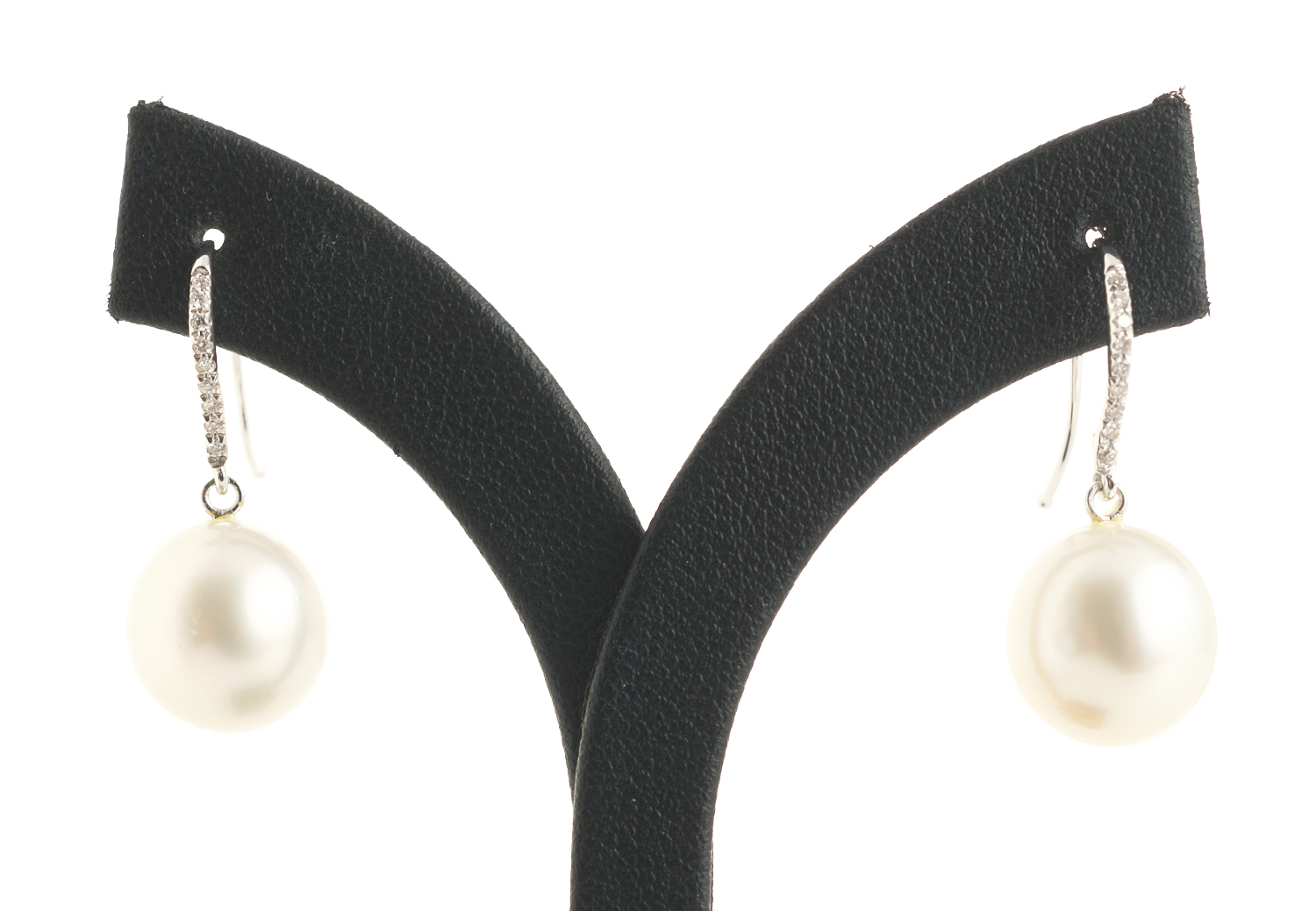 A PAIR OF SOUTH SEA PEARL AND DIAMOND EARRINGS, EACH EARRING COMPRISING A ROUND PEARL OF SILVER WHITE HUES MEASURING 9.0MM TO 10.0MM TO A DIAMOND SET SHEPHERD HOOK FITTING, IN 18CT WHITE GOLD