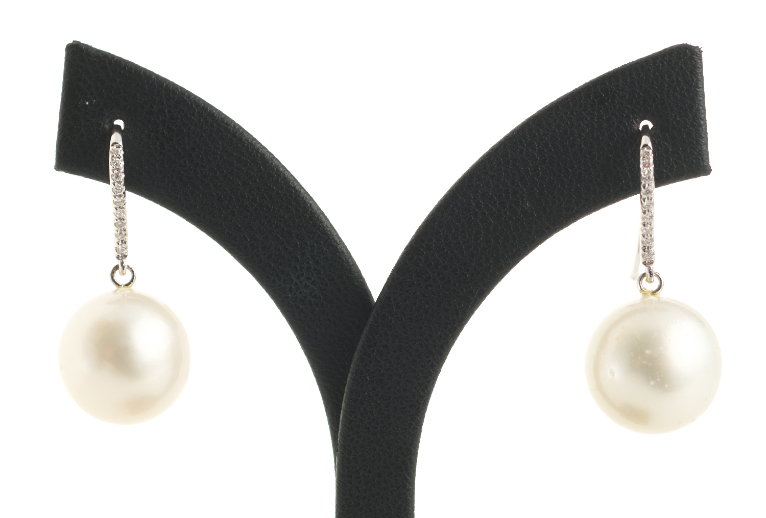 A PAIR OF SOUTH SEA PEARL AND DIAMOND EARRINGS - Each earring comprising a round pearl of silver white hues measuring 9.0mm to 10.0mm to a diamond set shepherd hook fitting, in 18ct white gold.