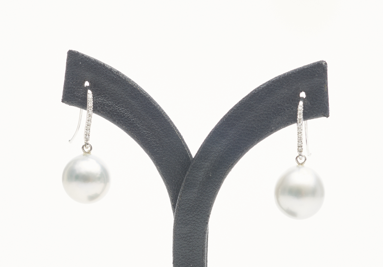A PAIR OF SOUTH SEA PEARL AND DIAMOND EARRINGS - Each earring comprising a round pearl of silver white hues measuring 9.0mm to 10.0mm to a diamond set shepherd hook fitting, in 18ct white gold.