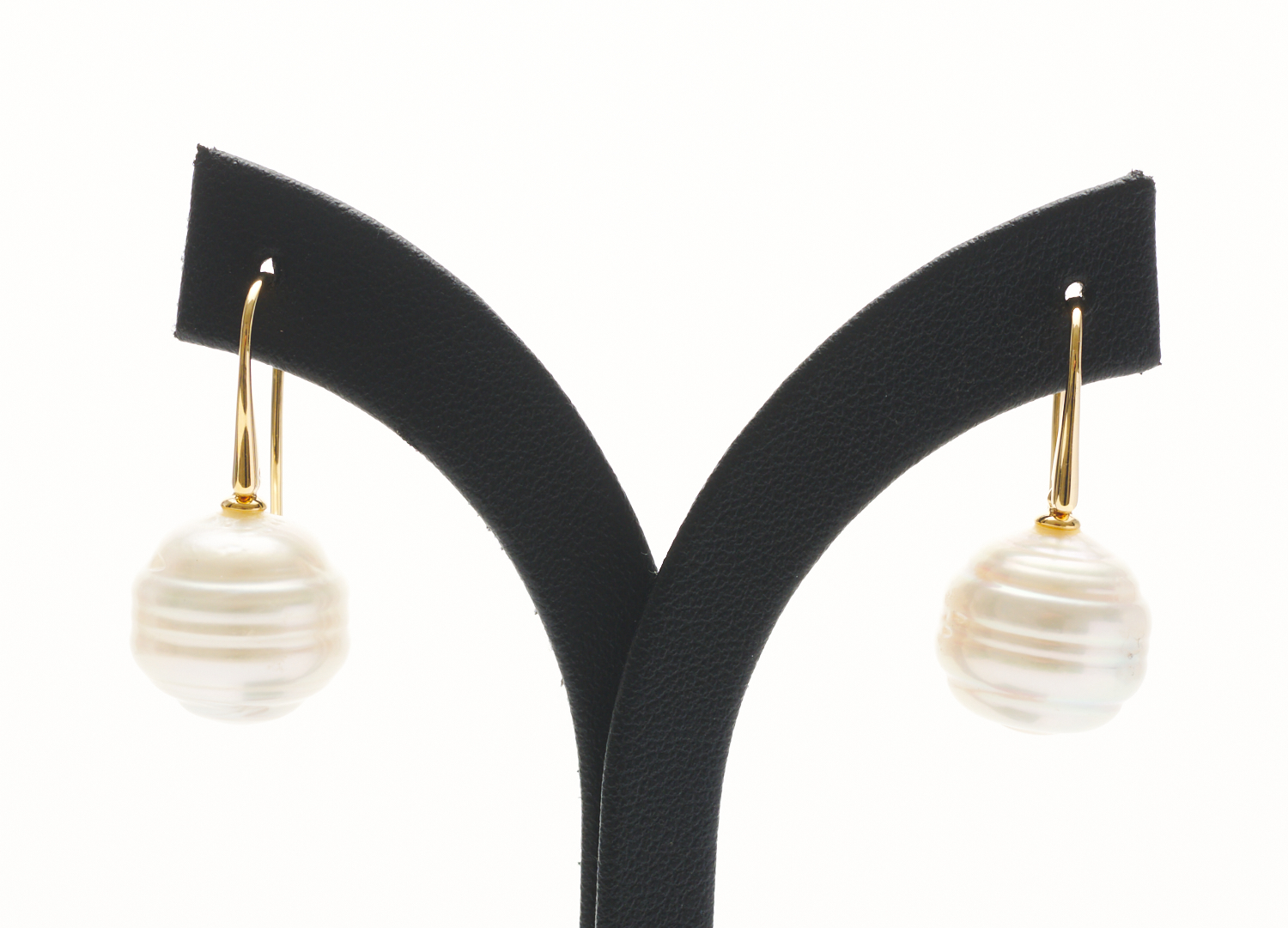 A PAIR OF SOUTH SEA PEARL EARRINGS Each earring comprising a baroque pearl (ringed) of cream hues measuring 13.0mm to 14.0mm, to shepherd hook fittings, in 18ct gold.