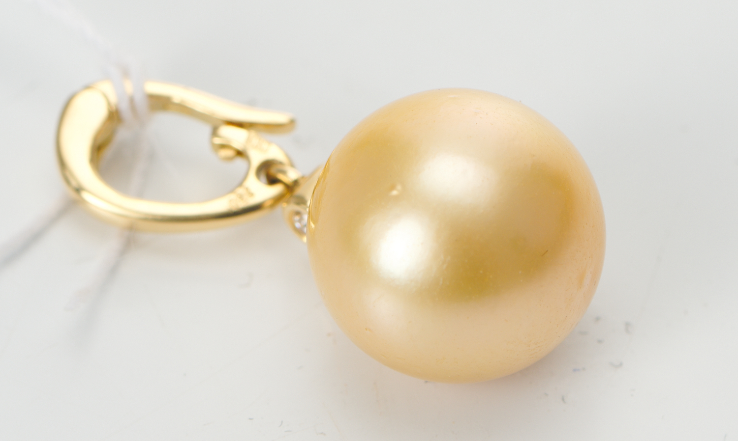 A SOUTH SEA PEARL AND DIAMOND PENDANT/ENHANCER IN 18CT GOLD, THE ROUND PEARL OF GOLDEN HUES MEASURING 14.0MM, SUSPENDED BELOW A SINGLE ROUND BRILLIANT CUT DIAMOND, WEIGHING 0.05CTS