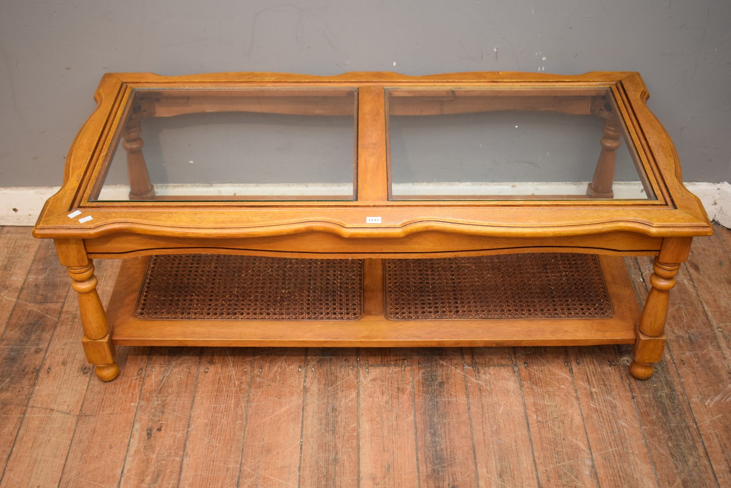 A TIMBER TWO TIER COFFEE TABLE WITH GLASS INSET (A/F) (41H x 118W x 58D CM) (LEONARD JOEL DELIVERY SIZE: LARGE)