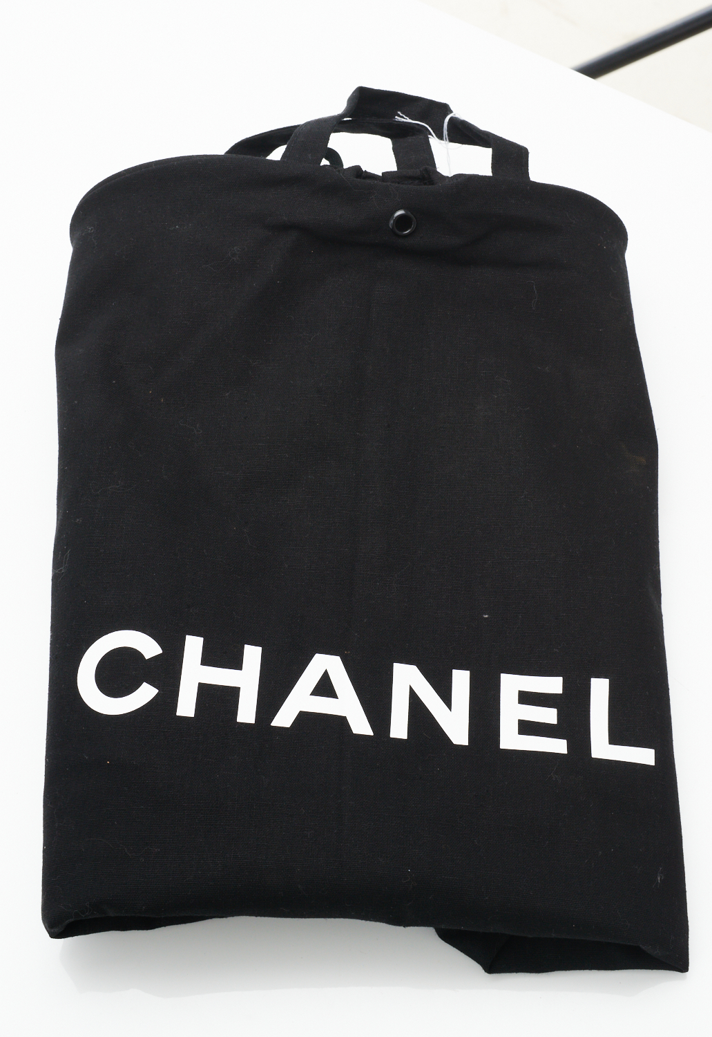 A GARMENT CARRIER BY CHANEL - Styled in black canvas with ''Chanel'' printed in white, 120 x 58cm.