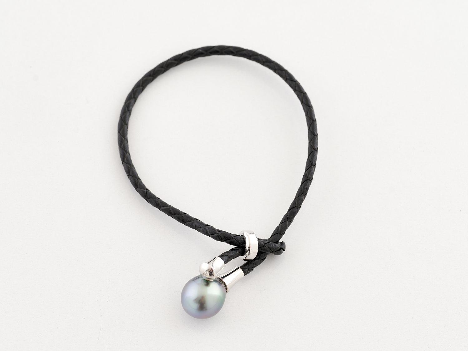 A TAHITIAN PEARL AND PLAITED BLACK LEATHER BRACELET TO STERLING SILVER FITTINGS, SIZE ADJUSTABLE, THE PEARL MEASURING APPROXIMATELY 11.28MM