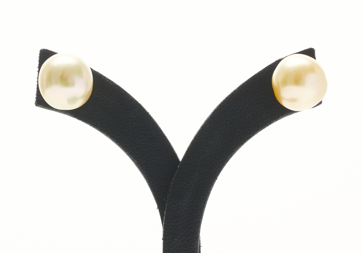 A PAIR OF SOUTH SEA PEARL STUD EARRINGS, EACH EARRING COMPRISING A SEMI BAROQUE PEARL OF PALE GOLDEN HUES MEASURING 11.0 TO 12.0MM, IN 18CT GOLD