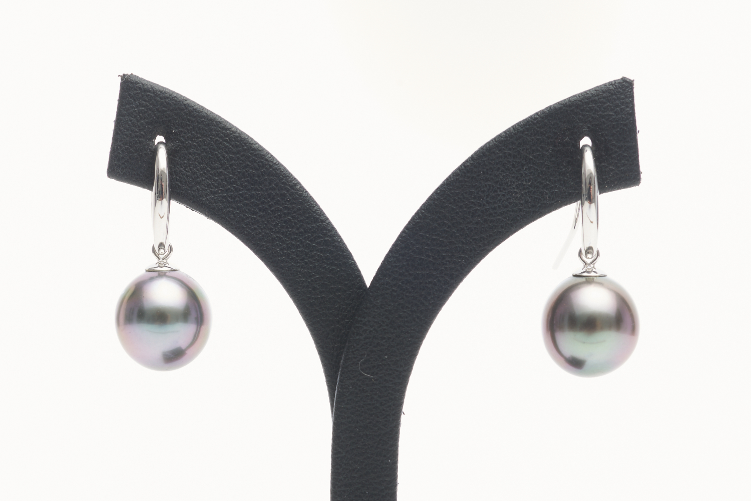 A PAIR OF TAHITIAN PEARL EARRINGS IN 18CT WHITE GOLD, EACH EARRING COMPRISING A NEAR ROUND PEARL OF AUBERGINE HUES MEASURING 11.0MM, TO SHEPHERD HOOK FITTINGS