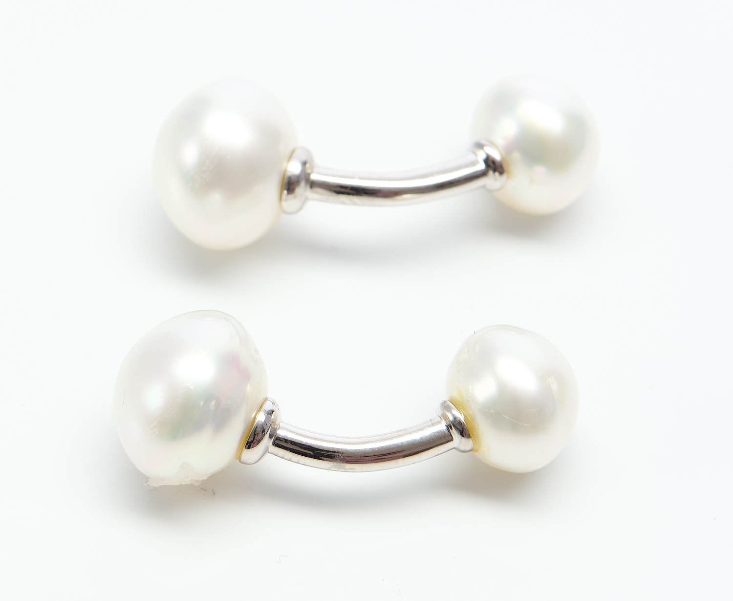 A PAIR OF SOUTH SEA PEARL CUFFLINKS, EACH TERMINAL SET WITH A SEMI BAROQUE PEARL ON CURVED BAR IN 9CT WHITE GOLD, THE PEARLS MEASURING 9.9MM - 12.0MM