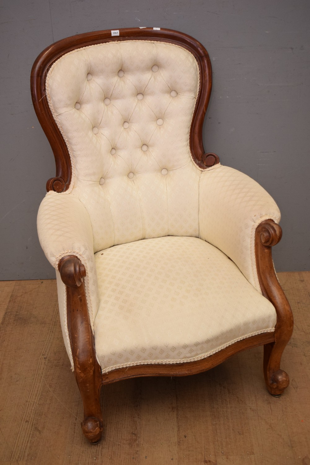 A VICTORIAN GENTLEMAN'S CHAIR IN CREAM UPHOLSTERY (A/F) (101H X 65W X 77D CM) (LEONARD JOEL DELIVERY SIZE: LARGE)