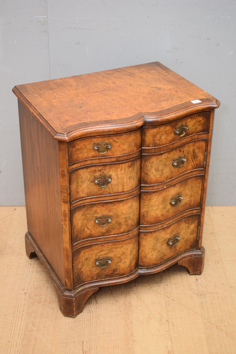 A GEORGIAN STYLE SERPENTINE FRONTED BURR WALNUT SINGLE DRAWER CABINET ( 62H X 51W X 37D CM) (LEONARD JOEL DELIVERY SIZE: MEDIUM)