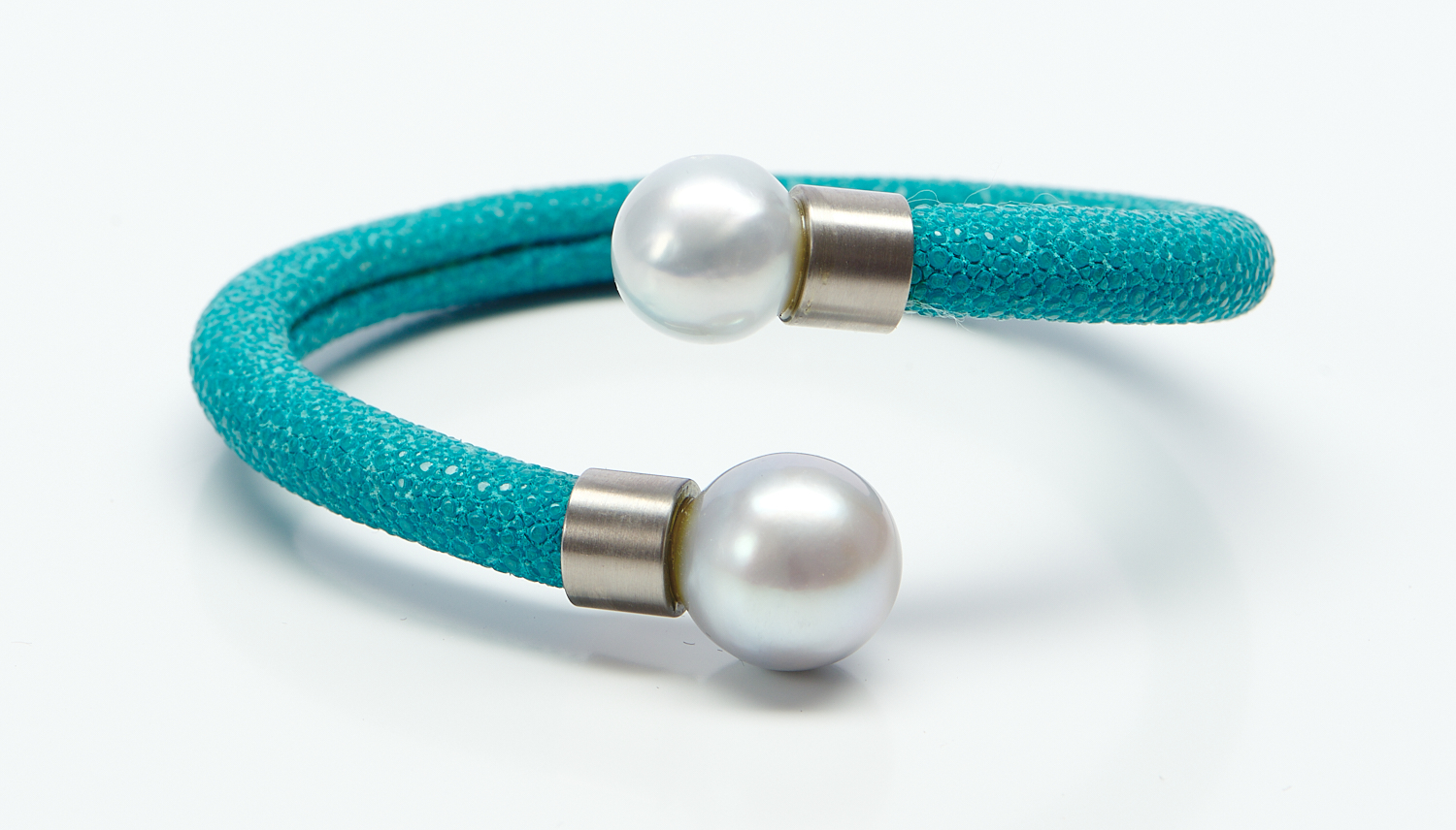 A SOUTH SEA PEARL AND STINGRAY LEATHER CUFF, THE FLEXIBLE CROSSOVER DESIGN IN TURQUOISE STINGRAY LEATHER HAVING TERMINALS SET WITH A WHITE PEARLS, MEASURING 13.2MM AND 11.4MM RESPECTIVELY, TO STAINLESS STEEL FITTINGS