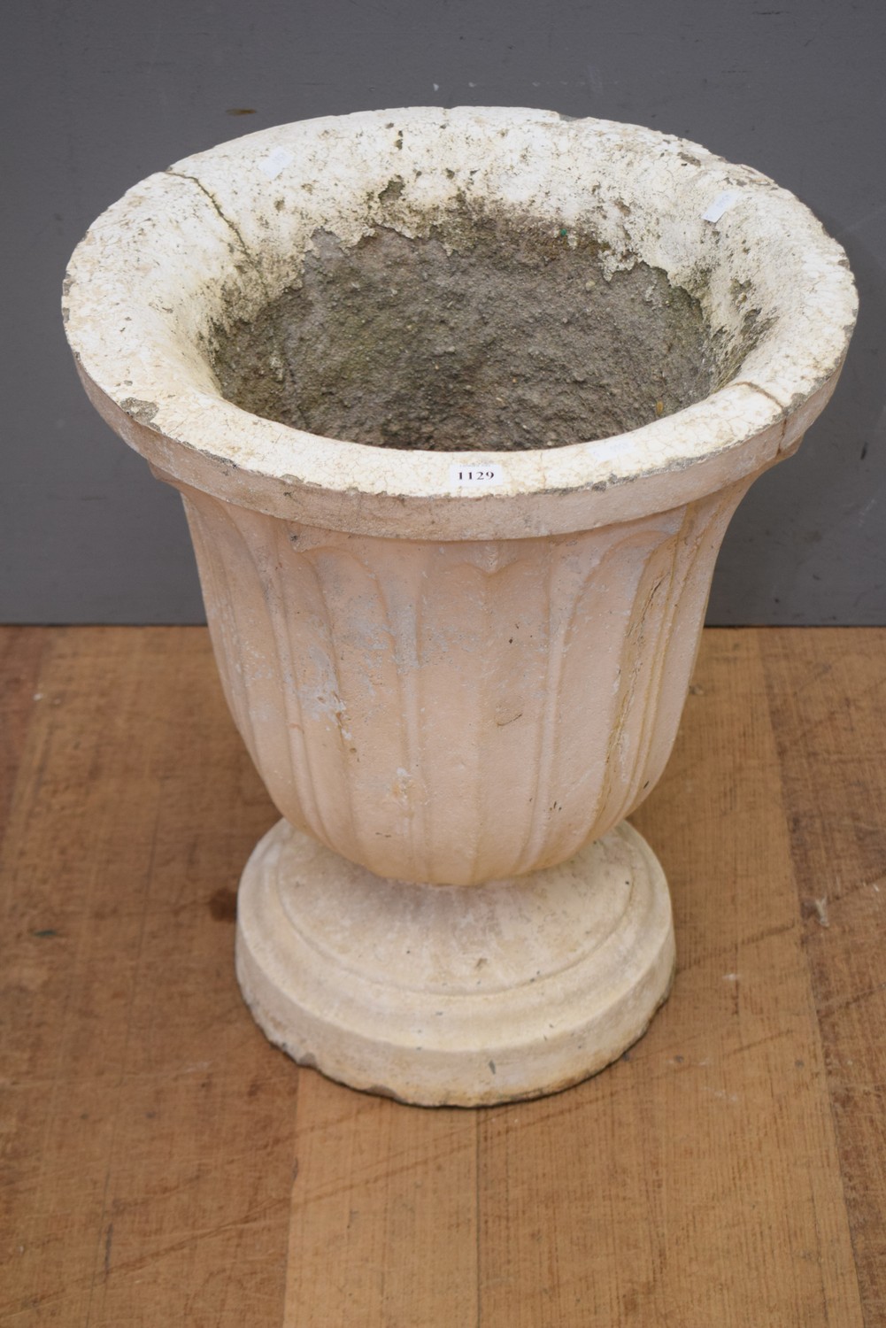A CLASSICAL STYLE CONCRETE GARDEN URN (A/F) (50H x 43D CM) (PLEASE NOTE THIS HEAVY ITEM MUST BE REMOVED BY CARRIERS AT THE CUSTOMER'S EXPENSE. LEONARD JOEL STAFF CANNOT ASSIST CARRYING THIS ITEM) (X-LARGE ITEM)