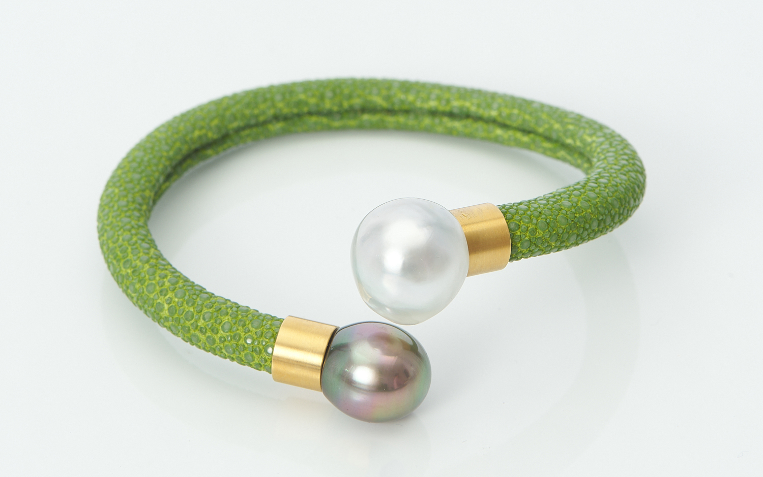 A SOUTH SEA PEARL AND STINGRAY LEATHER CUFF, THE FLEXIBLE CROSSOVER DESIGN IN GREEN STINGRAY LEATHER HAVING TERMINALS SET WITH A WHITE PEARL AND TAHITIAN PEARL, MEASURING 15.7MM AND 12.3MM RESPECTIVELY, TO GOLD TONE STAINLESS STEEL FITTINGS