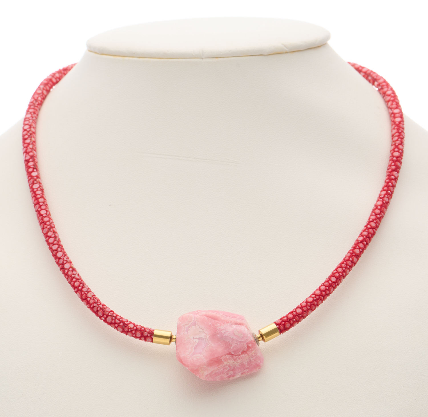 A RHODOCHROSITE AND STINGRAY LEATHER COLLAR, COMPRISING A LARGE FREEFORM RHODOCHROSITE MEASURING 24.1MM BY 26.5MM ON A RED STINGRAY LEATHER COLLAR WITH GOLD TONE STAINLESS STEEL FITTINGS