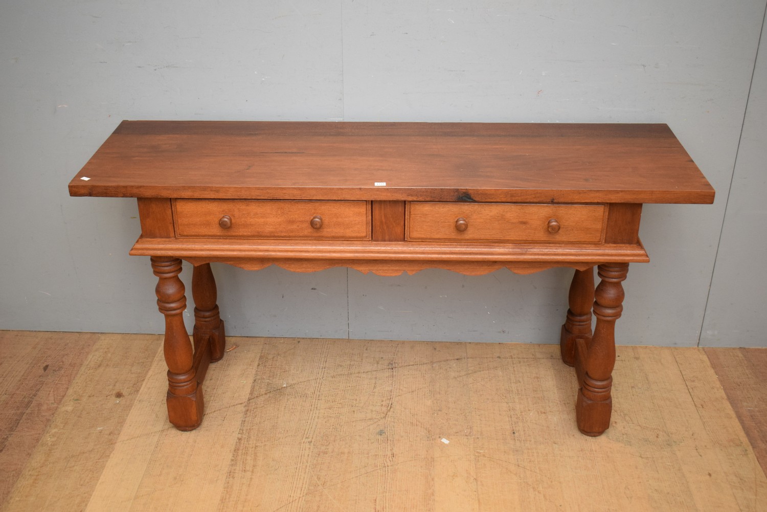 A SOLID HARDWOOD TWO DRAWER CONSOLE (75H x 151W x 45D CM) (PLEASE NOTE THIS HEAVY ITEM MUST BE REMOVED BY CARRIERS AT THE CUSTOMER'S EXPENSE. LEONARD JOEL STAFF CANNOT ASSIST CARRYING THIS ITEM) (X-LARGE ITEM)