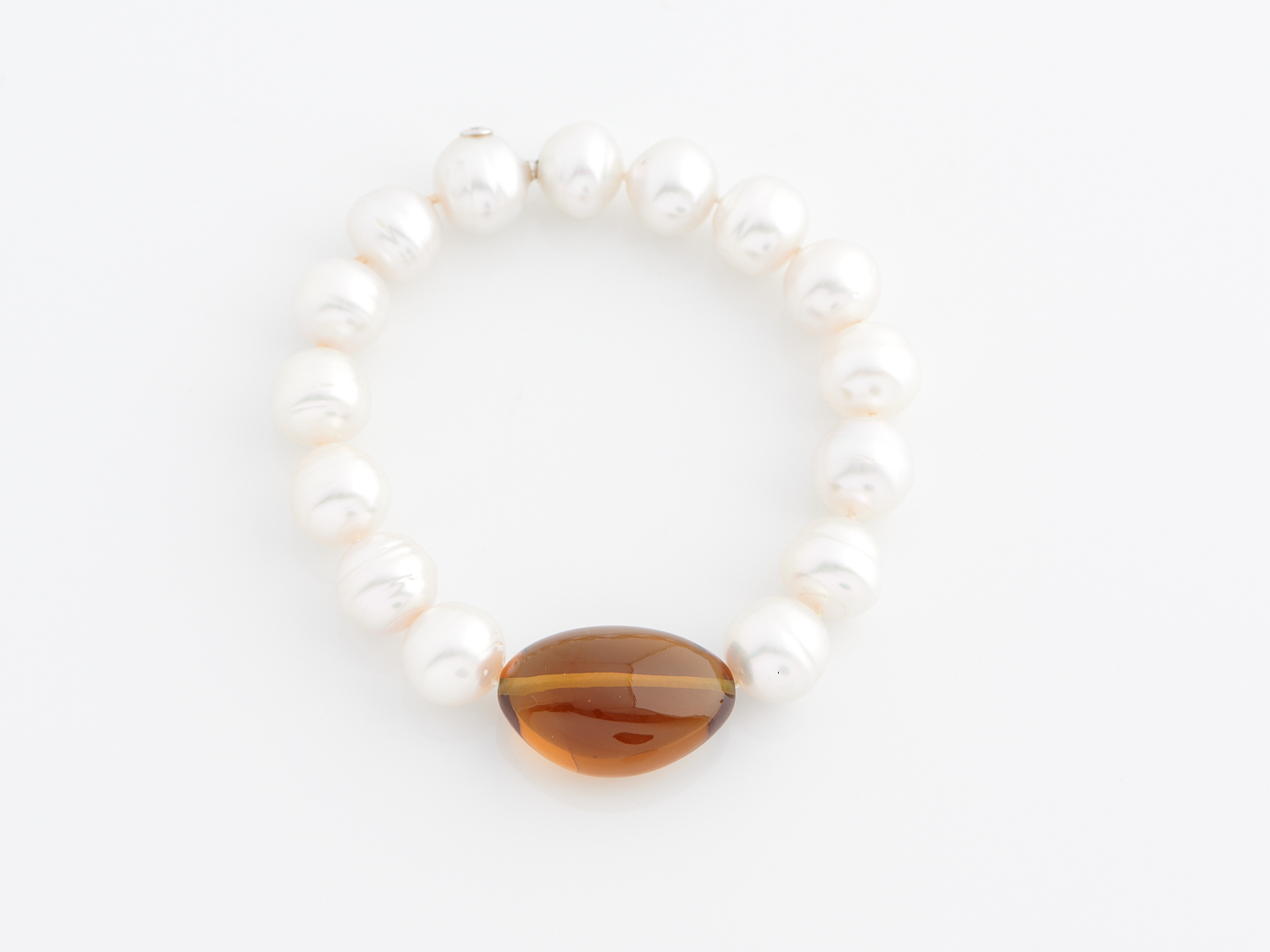 A SOUTH SEA PEARL AND SMOKEY QUARTZ BRACELET, COMPRISING FIFTEEN SEMI BAROQUE PEARLS OF SILVER WHITE HUES WITH A TUMBLED SMOKEY QUARTZ BEAD AND A DIAMOND SET BAYONET CLASP, IN 18CT WHITE GOLD, TOTAL LENGTH 210MM.