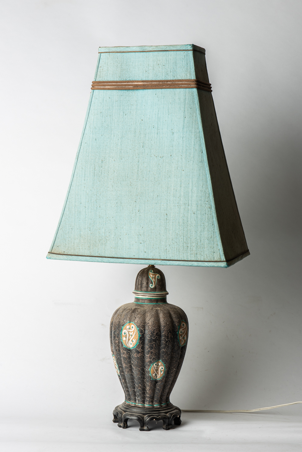 A CHINESE FLUTED BALUSTER VASE AND COVER CONVERTED TO A LAMP WITH ROSEWOOD CARVED BASE, 90 CM HIGH INCLUDING THE BASE AND SHADE, LEONARD JOEL LOCAL DELIVERY SIZE: SMALL