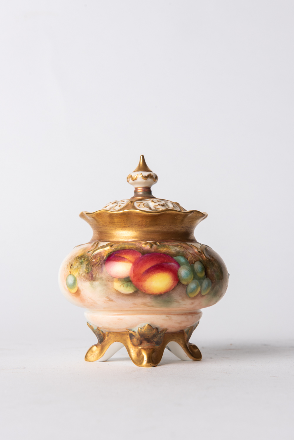 A ROYAL WORCESTER SQUAT POT POURRI LIDDED VASE HAND PAINTED AND GILT WITH FRUIT, SIGNED, 11 CM HIGH, LEONARD JOEL LOCAL DELIVERY SIZE: SMALL