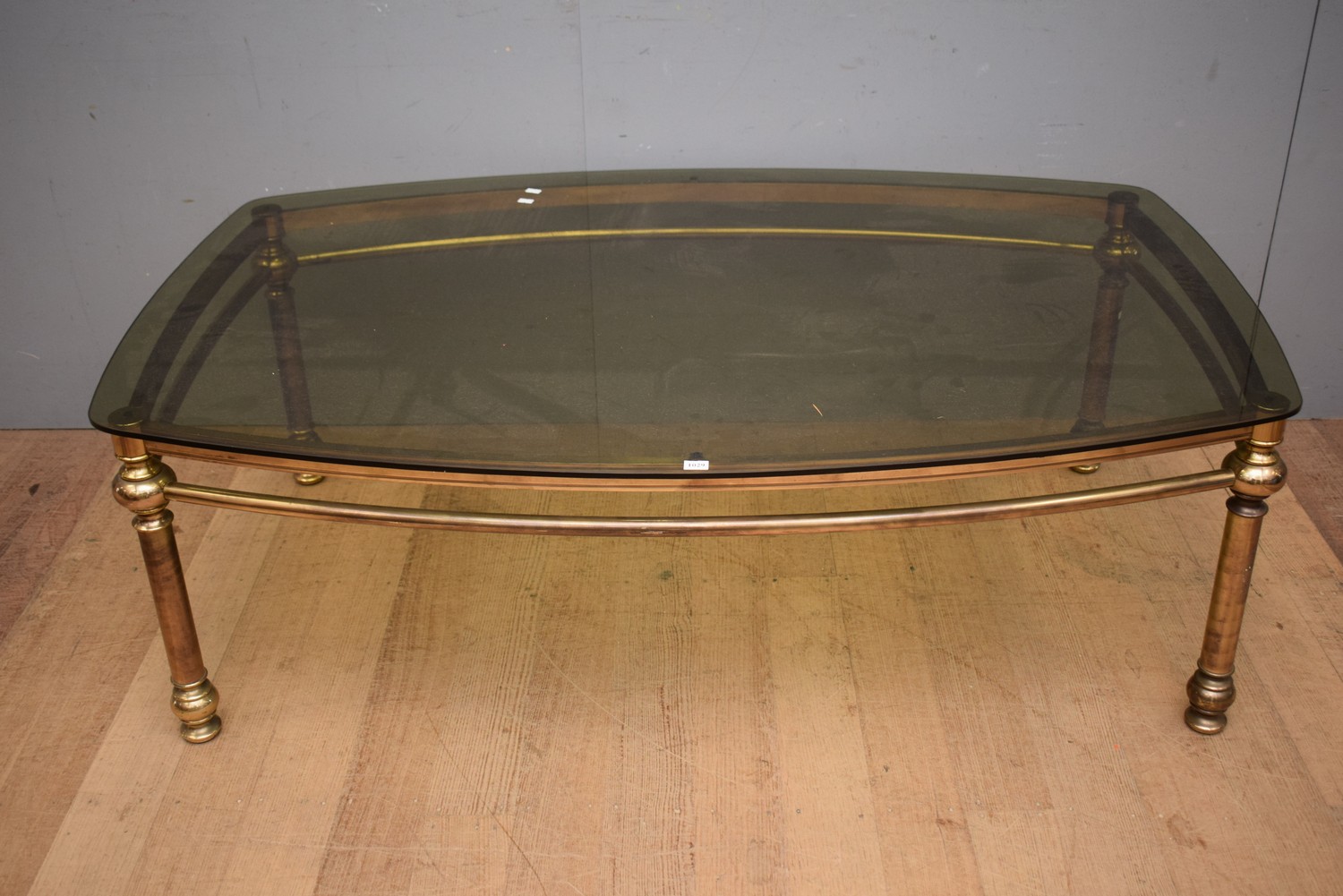 A MID-CENTURY ITALIAN BRASS SMOKED GLASS COFFEE TABLE (MINOR CHIP TO GLASS) (47H X 141W X 92D CM) (PLEASE NOTE THIS HEAVY ITEM MUST BE REMOVED BY CARRIERS AT THE CUSTOMER'S EXPENSE. LEONARD JOEL STAFF CANNOT ASSIST CARRYING THIS ITEM) (X-LARGE ITEM)