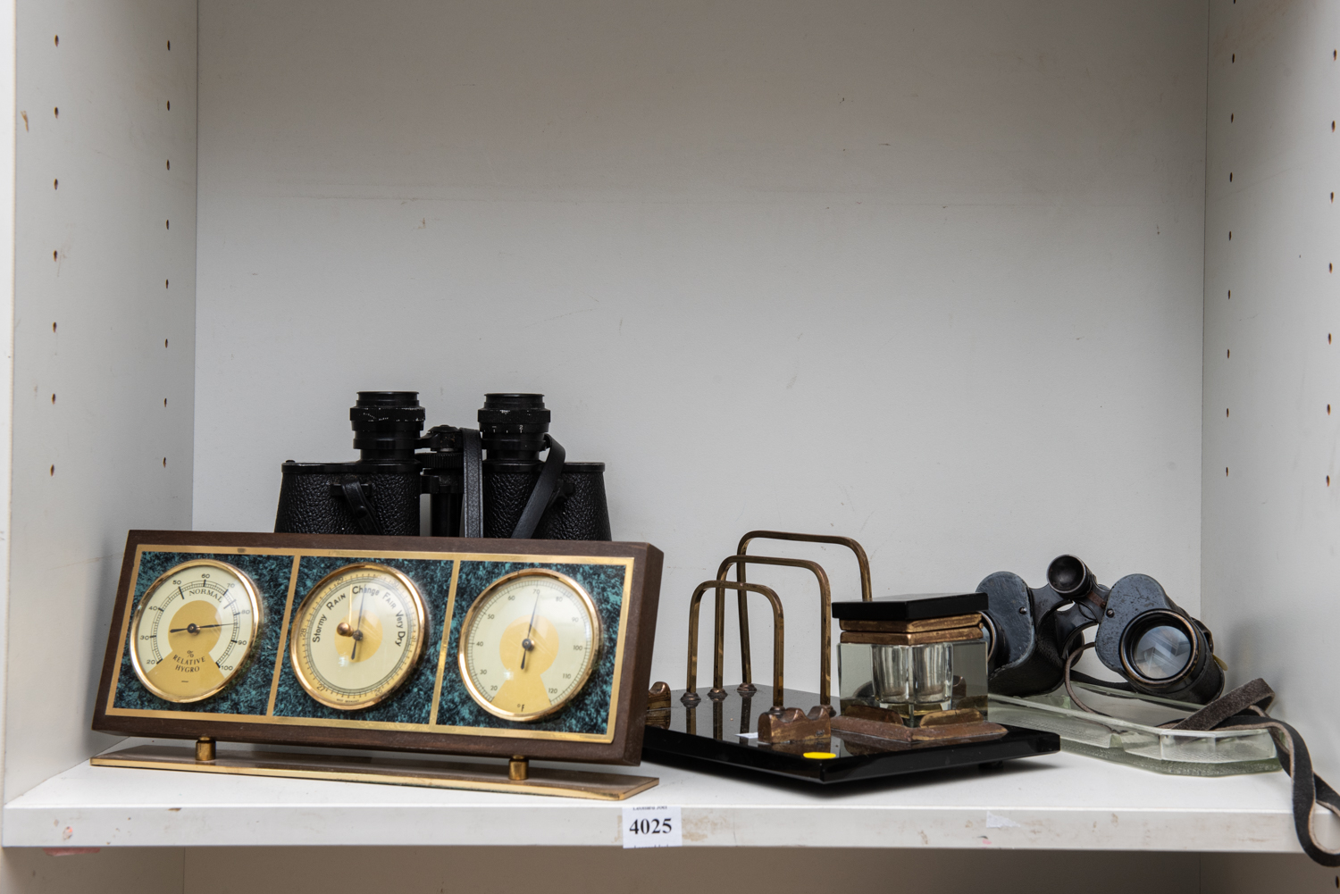 A DESK STAND, COMBINATION DESK THERMOMETER/BAROMETER/CHRONOMETER, TWO PAIRS OF BINOCULARS AND A PRESSED GLASS PEN TRAY, LEONARD JOEL LOCAL DELIVERY SIZE: SMALL