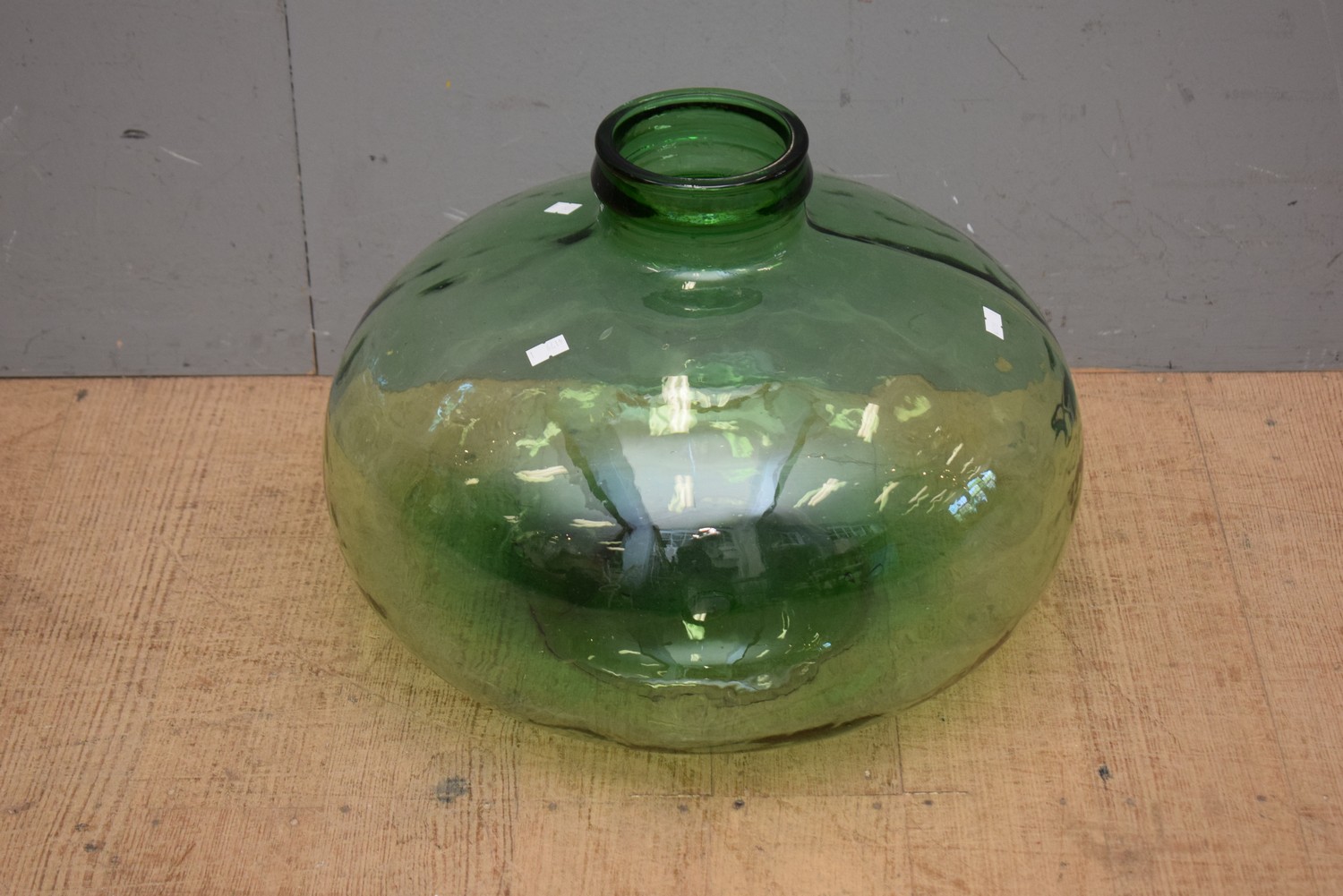 A GREEN GLASS SMALL DEMIJOHN (33H X 45DIAMETER CM) (LEONARD JOEL DELIVERY SIZE: MEDIUM)