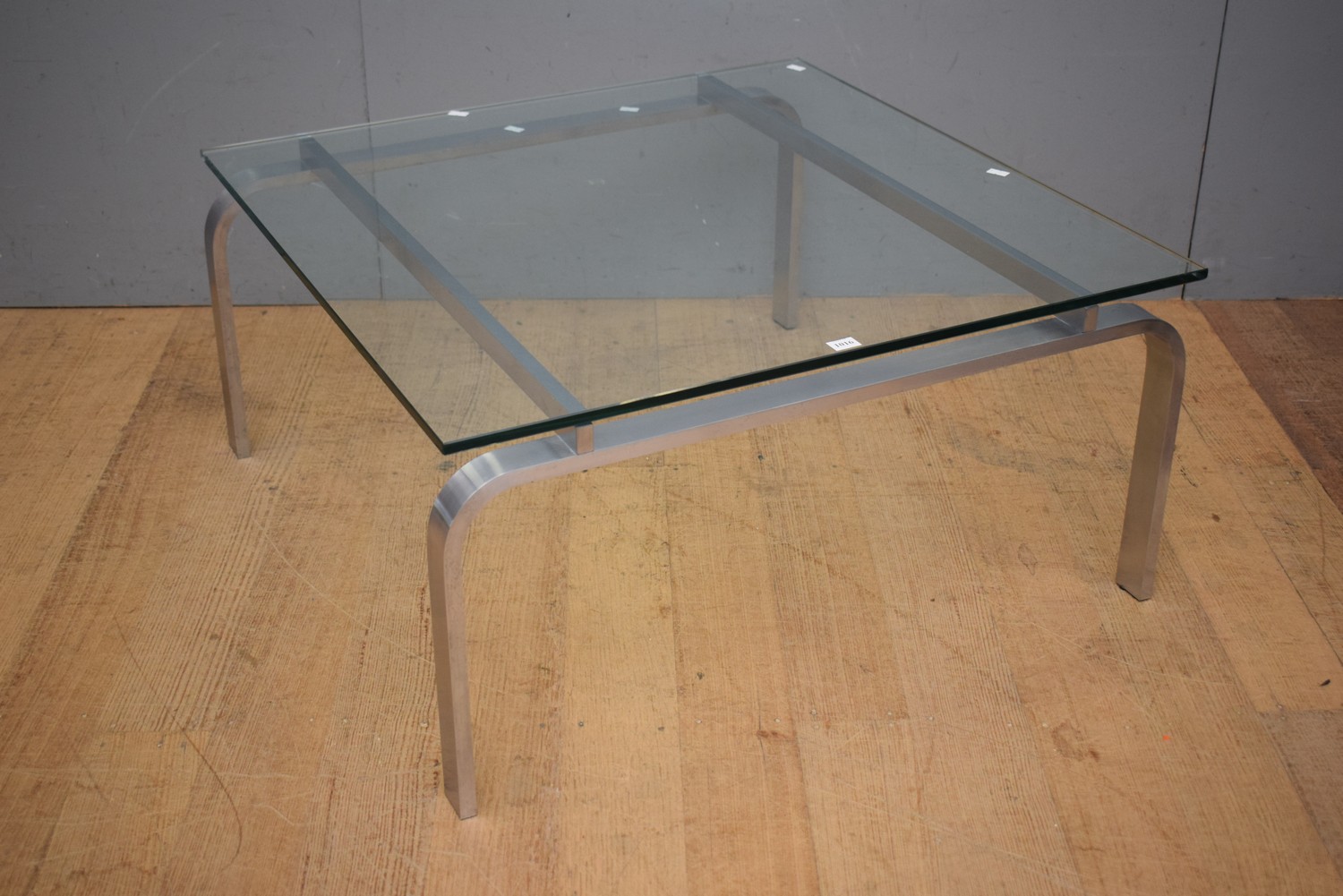 A HEAVY STEEL AND GLASS TOPPED COFFEE TABLE ( 36H X 75W X 35D CM) (LEONARD JOEL DELIVERY SIZE: LARGE)