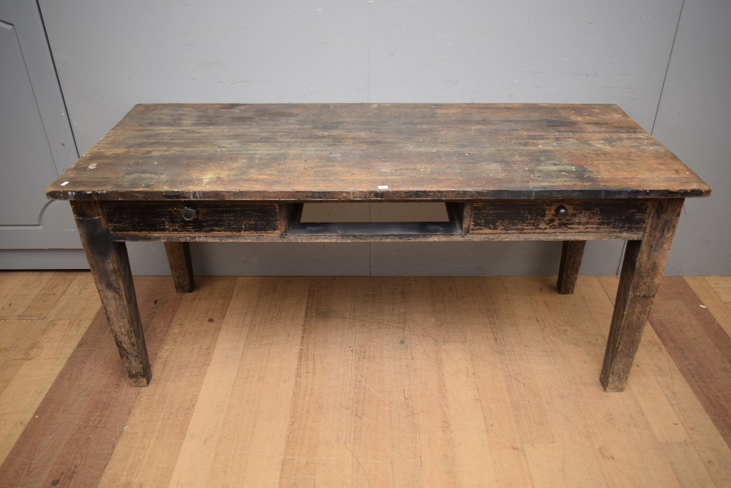 A SOLID HARDWOOD 1950S LAB TABLE (A/F MISSING DRAWER ) (80H X 83W X 76D CM) (PLEASE NOTE THIS HEAVY ITEM MUST BE REMOVED BY CARRIERS AT THE CUSTOMER'S EXPENSE. LEONARD JOEL STAFF CANNOT ASSIST CARRYING THIS ITEM) (X-LARGE ITEM)