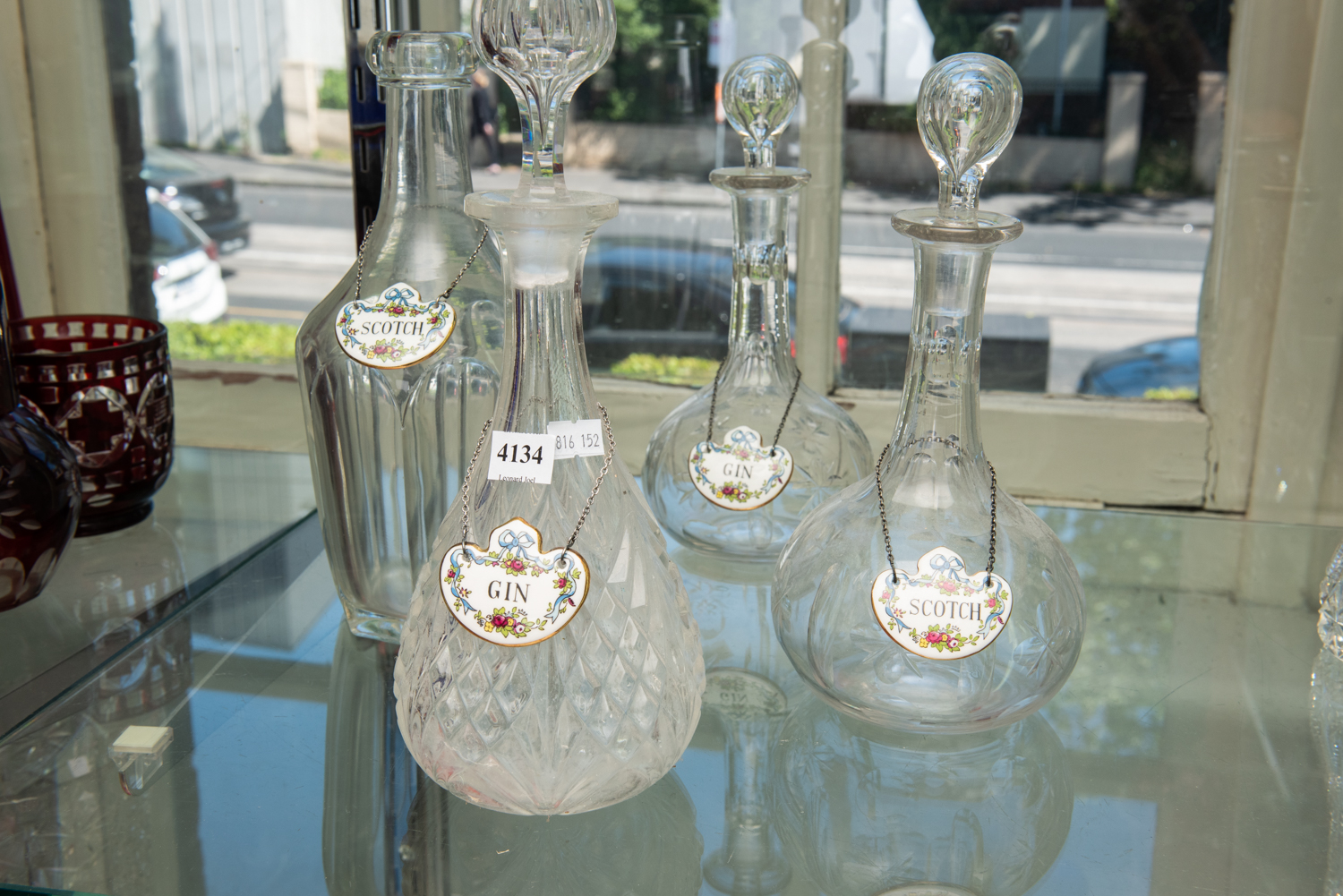 FOUR CRYSTAL DECANTERS WITH PORCELAIN LIQUOR LABELS (ONE STOPPER MISSING), LEONARD JOEL LOCAL DELIVERY SIZE: SMALL