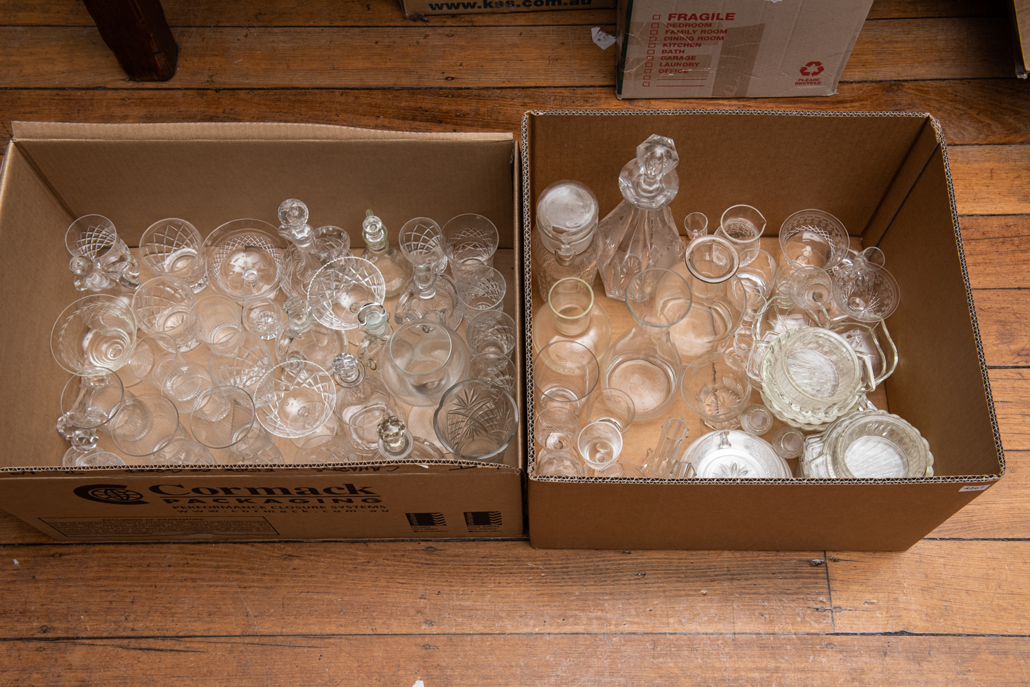 TWO BOXES OF ASSORTED CRYSTAL AND GLASS, INCLUDING ETCHED, LEONARD JOEL LOCAL DELIVERY SIZE: SMALL