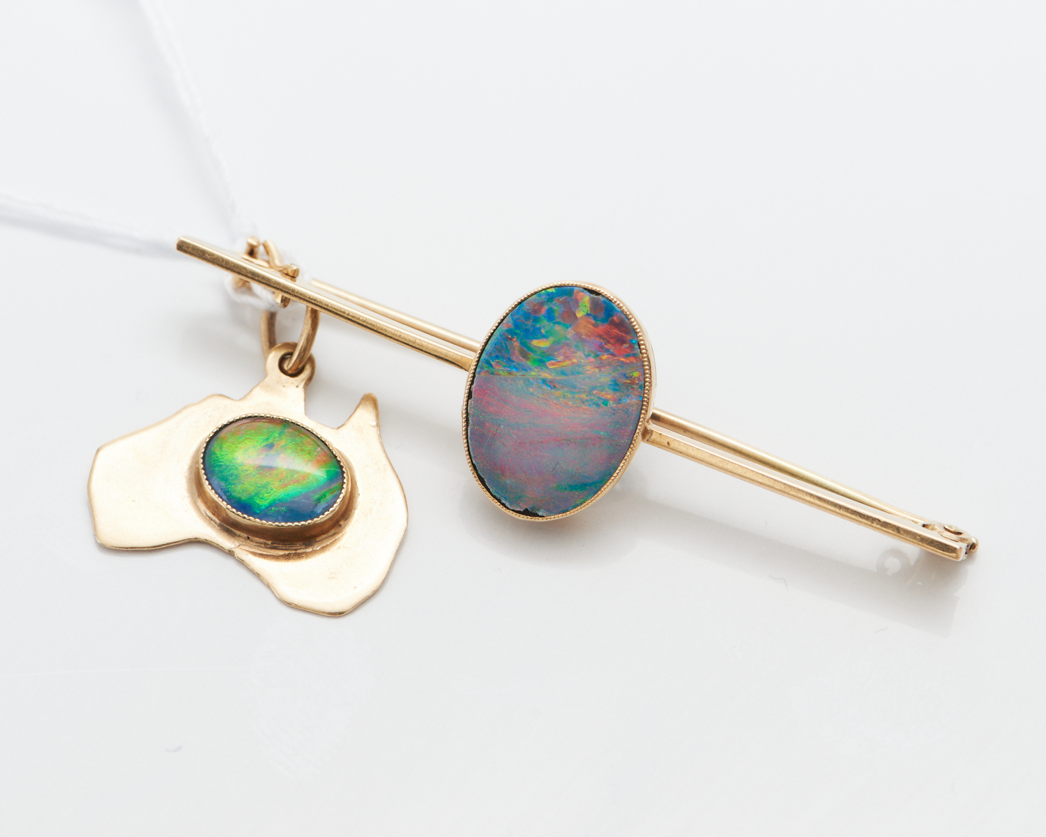 AN OPAL DOUBLET BAR BROOCH IN 15CT GOLD, LENGTH 5CMS, 3.4GMS TOGETHER WITH AN OPAL TRIPLET PENDANT FEATURING AUSTRALIA IN 9CT GOLD, 1.7GMS