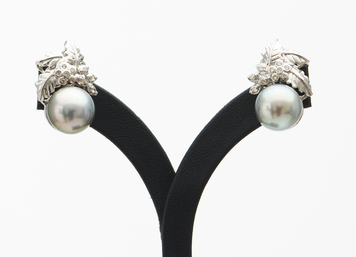 A PAIR OF TAHITIAN PEARL AND DIAMOND EARRINGS ACID TESTED IN 14CT WHITE GOLD, PEARLS MEASURING 12MM, TO POST AND BUTTERFLY FITTINGS, 14.3GMS
