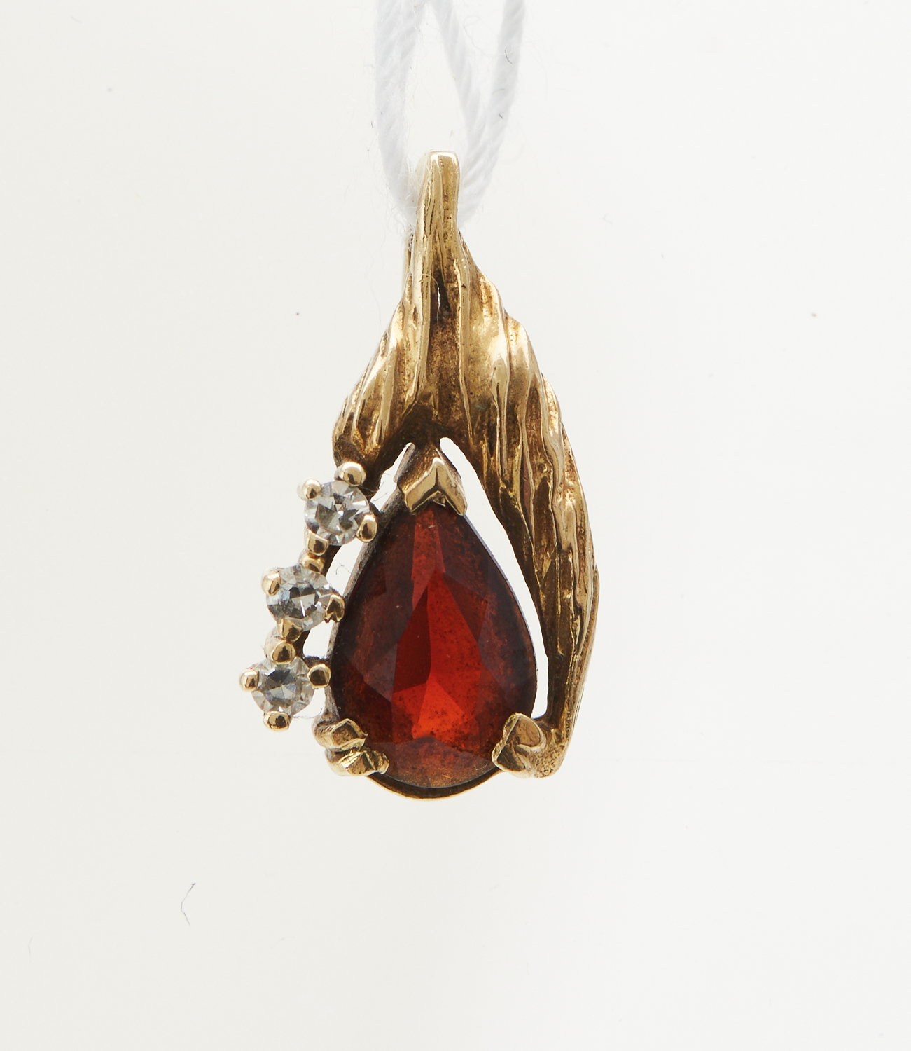 A GARNET AND DIAMOND PENDANT IN 9CT GOLD, 1.1GMS