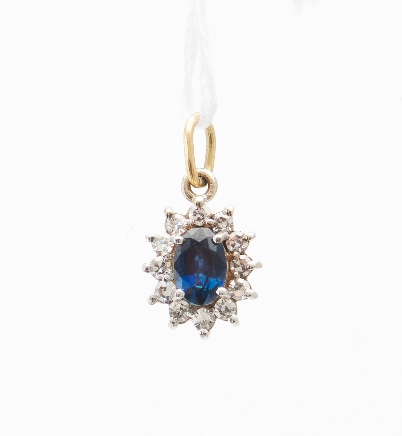 A SAPPHIRE AND DIAMOND PENDANT IN 14CT GOLD, 1.3GMS