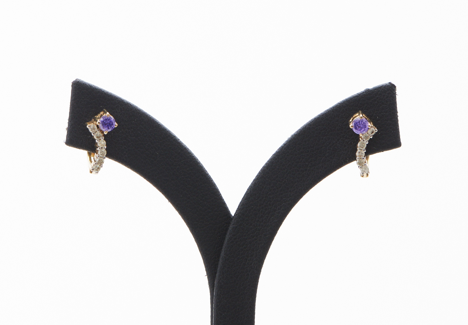 A PAIR OF DIAMOND AND AMETHYST EARRINGS IN 14CT GOLD, TO POST FITTINGS, 2.3GMS