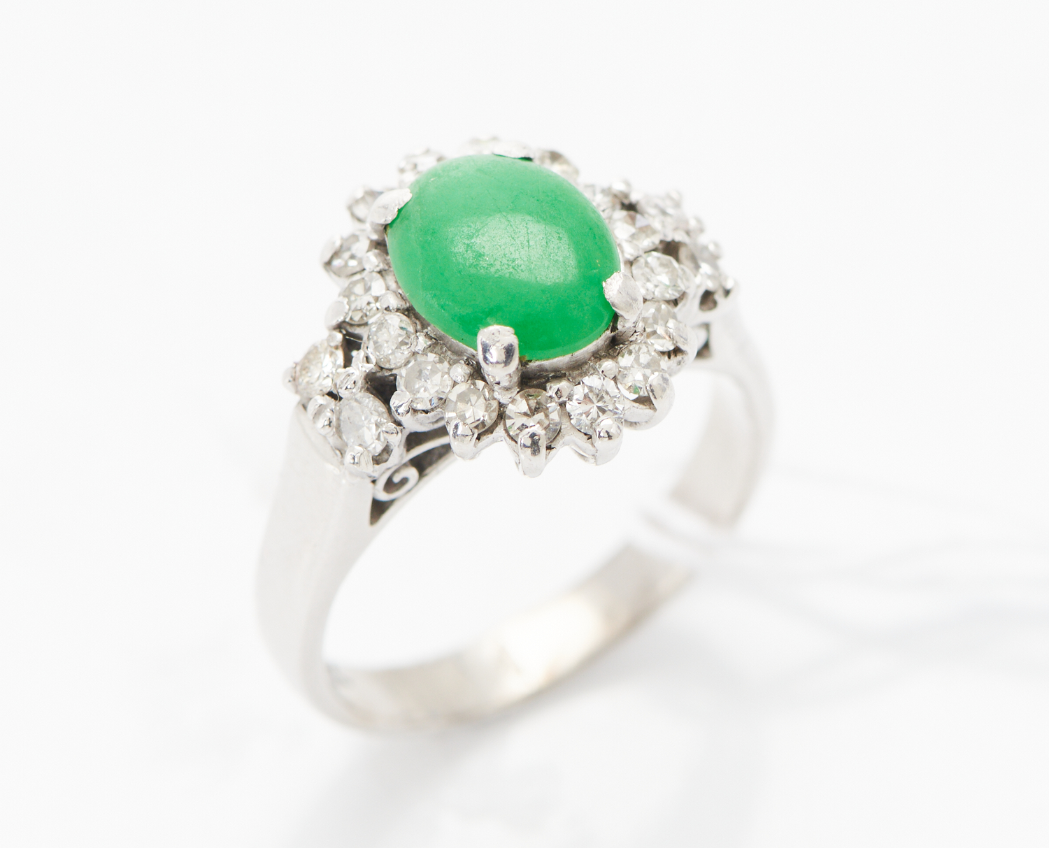 A DIAMOND AND JADEITE CLUSTER RING IN 18CT WHITE GOLD, SIZE K, 4.6GMS