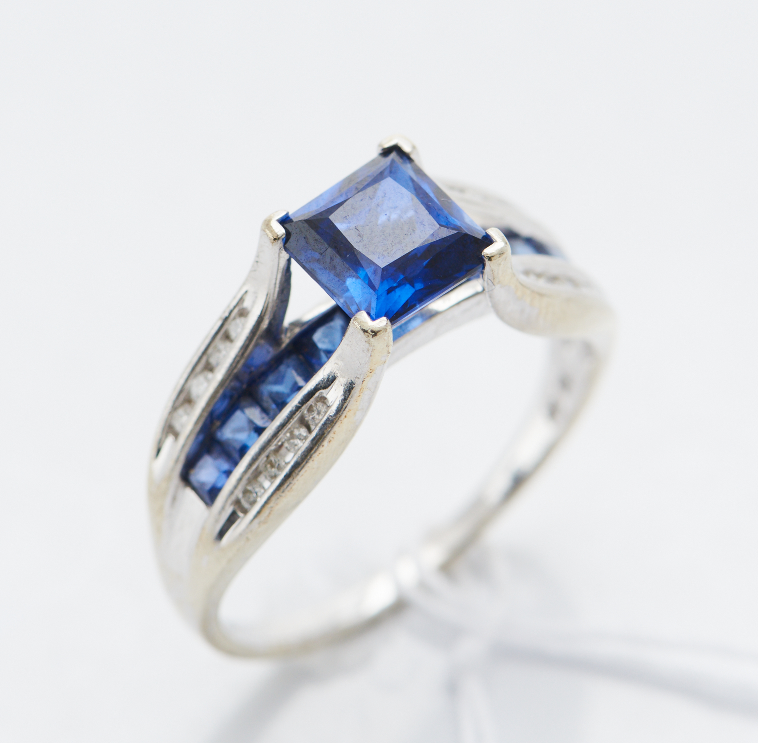 A BLUE STONE AND DIAMOND RING IN 9CT WHITE GOLD, SIZE T, 4.8GMS