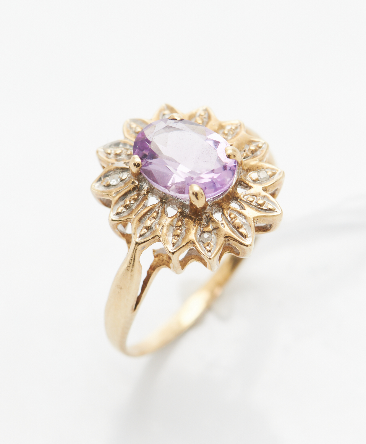 AN AMETHYST AND DIAMOND RING IN 9CT GOLD, SIZE L-M, 2.3GMS