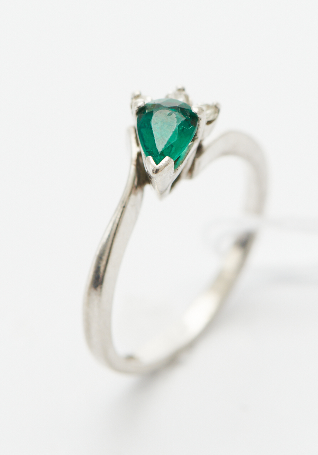 AN EMERALD AND DIAMOND RING IN 18CT WHITE GOLD, SIZE J, 2.4GMS