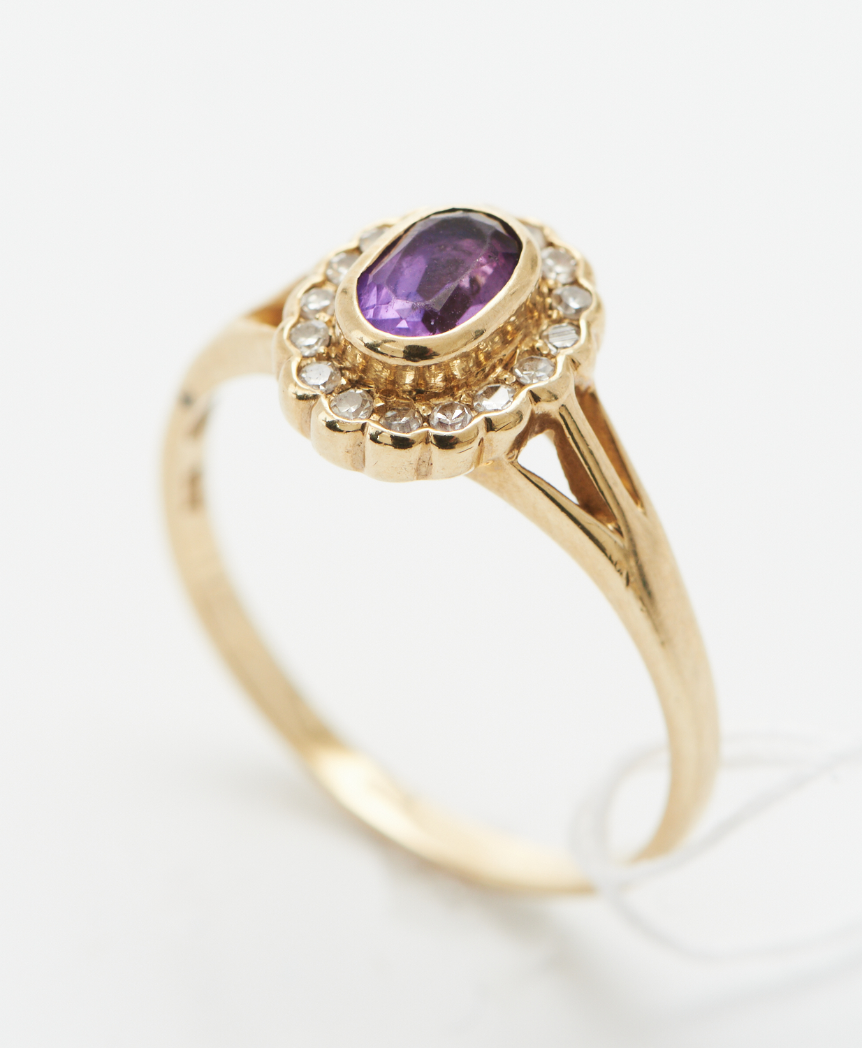 AN AMETHYST AND DIAMOND CLUSTER RING IN 9CT GOLD, SIZE R, 2.8GMS