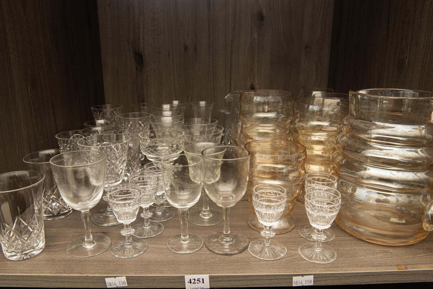 A SHELF OF ASSORTED CRYSTAL AND GLASSWARE, LEONARD JOEL LOCAL DELIVERY SIZE: SMALL