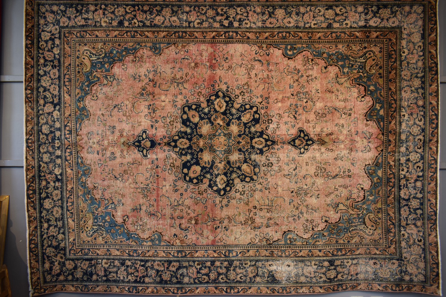 AN EXCEPTIONAL CONTEMPORARY VINTAGE OVER-DYED PERSIAN TABRIZ CARPET, VINTAGE PILE. A UNIQUE MODERN CARPET CREATED FROM AN AUTHENTIC VINTAGE MEDALLION DESIGN TABRIZ CARPET WITH THE PILE SHORN AND OVER-DYED IN COBALT BLUE, RED AND TAN TONES. GALLERY EXHIBITED. CERTIFICATE OF AUTHENTICITY INCLUDED. SIZE: 372X275CM ORIGIN: PERSIA - RRP: $8,900 (LEONARD JOEL DELIVERY SIZE: LARGE)