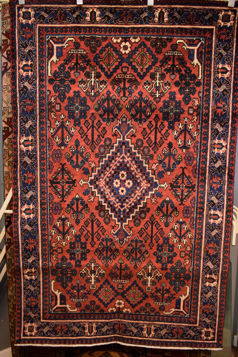 A CIRA 1950'S JOSHAGAN RUG, 100% WOOL. VINTAGE PILE. FULLY RESTORED. DISTINCT VILLAGE DESIGN FROM THE ISFAHAN PROVINCE WITH A DIAMOND-SHAPED MEDALLION & CORNER MEDALLIONS IN A FIELD CONTAINING DIAGONAL ROWS OF FLORAL SPRAYS. BORDER OF PALMETTES. EX-GALLERY STOCK. IN GOOD CONDITION. CERTIFICATE OF AUTHENTICITY INCLUDED. SIZE: 205X130CM ORIGIN: PERSIA - RRP: $1,900