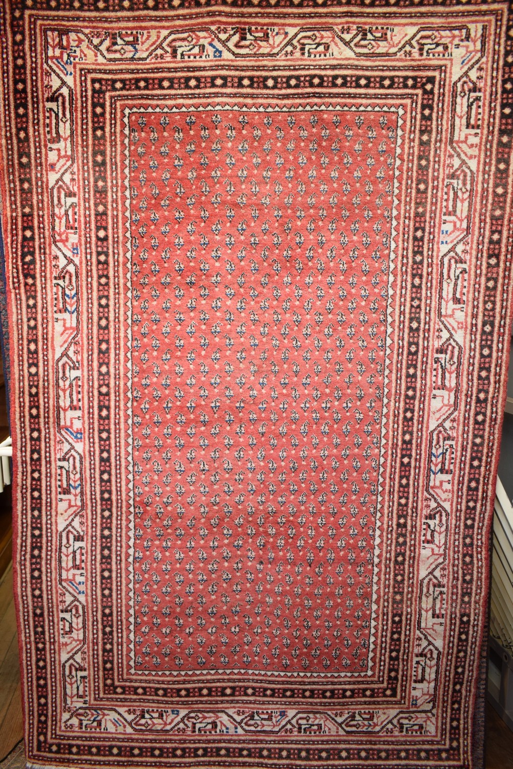 A PERSIAN MIR SERABAND CARPET, 100% WOOL PILE. HAND-KNOTTED TRIBAL DESIGN OF ALL-OVER PAISLEY MOTIFS IN A RED FIELD. WIDE BORDER OF GEOMETRIC PATTERNS. GALLERY INVENTORY. IN EXCELLENT CONDITION. SIZE: 220X127CM ORIGIN: PERSIA - RRP: $1,800