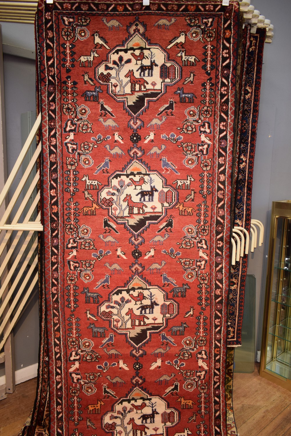 A RARE & COLLECTABLE TAJABAD HALL RUNNER, 100% WOOL. DENSE PILE. HAND-KNOTTED VILLAGE WEAVE WITH RARE PICTORIAL DESIGN OF TRIPLE MEDALLIONS CONTAINING "TREES OF LIFE & HORSE & BIRD FORMS IN A RED FIELD OF SECONDARY FLORAL MOTIFS & BIRD & HORSE FORMS. MINOR BORDERS OF FLOWER HEADS. GALLERY INVENTORY. IN EXCELLENT CONDITION. CERTIFICATE OF AUTHENTICITY INCLUDED. SIZE: 343X108 ORIGIN: PERSIA - RRP: $2,200