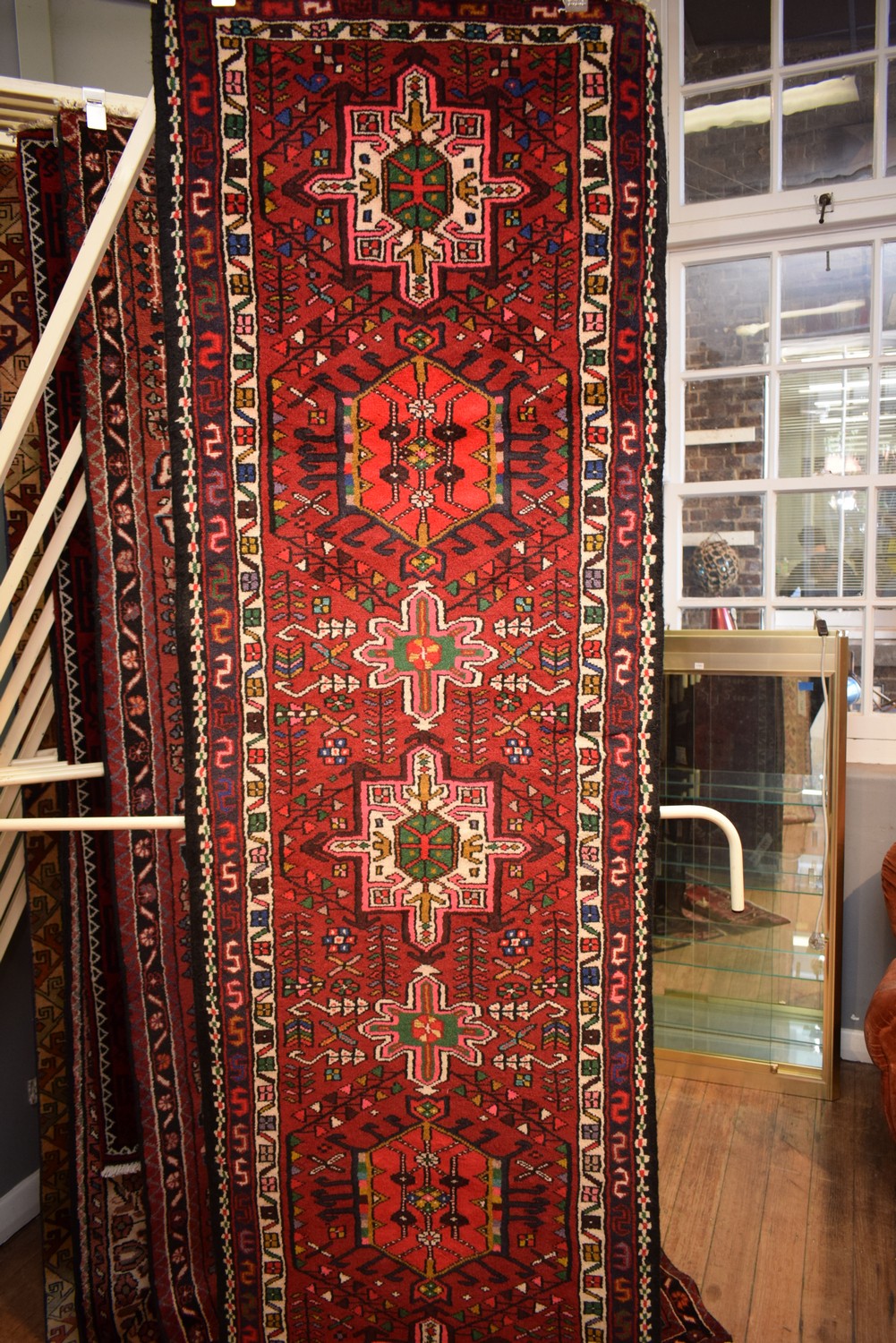 A HARD-WEARING PERSIAN GHARAJEH HALL RUNNER. 100% WOOL. SOLID & DENSE PILE. HAND-KNOTTED VILLAGE WEAVE WITH CAUCASIAN-INFLUENCED DESIGN OF ALTERNATING STYLIZED MEDALLIONS IN A FIELD OF FLORAL PATTERNS. MINOR BORDERS OF FLOWER HEADS & GEOMETRIC PATTERNS. EX-GALLERY INVENTORY. IN EXCELLENT CONDITION. CERTIFICATE OF AUTHENTICITY INCLUDED. SIZE: 249X75CM ORIGIN: PERSIA - RRP: $2,400